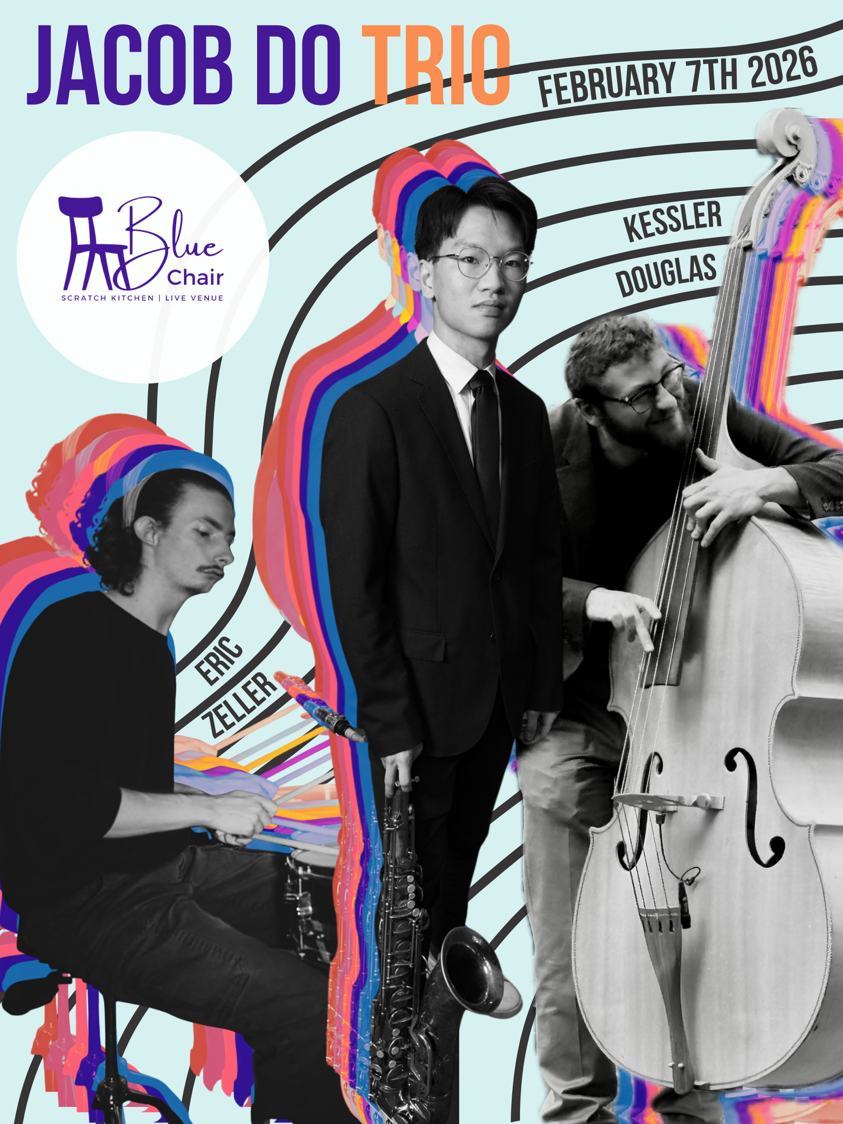 Come check out the Jacob Do Trio featuring Kessler Douglas (bass) and Eric Zeller (drums) on February 7th, 2026 at the Blue Chair. Reservations are recommended through the Blue Chair.